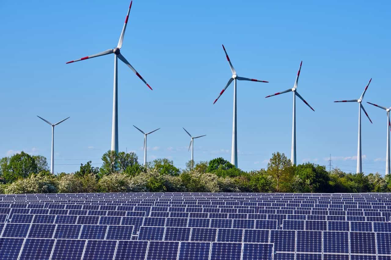 %[Lithium-ion battery on a solar panel with wind turbines and electric vehicles in the background]